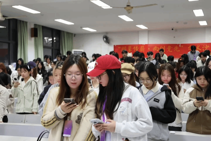 在互动问答环节,同学们踊跃提问,就零基础竞赛入门、学业与竞赛平衡、团队组队技巧等问题与分享嘉宾深入交流,现场气氛热烈。活动还开展了2026年中国国际大学生创新大赛院赛宣传动员,并组织全体参会同学进行学术诚信宣誓,进一步强化了同学们的竞赛意识和学术规范观念。